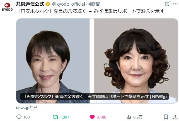 これで「みずほ銀行&正統派エコノミストグループVS高市真理教信者」の論争は決着がつき全国紙、地方紙で「総理の円安不適切発言」として報道され有権者の意識に浸透する。
