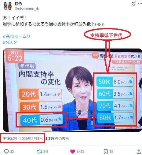 Nスタで40代~80代の5世代の内閣支持率が軒並み低下している。20代前半、特に大学生は投票に行かないだろう。