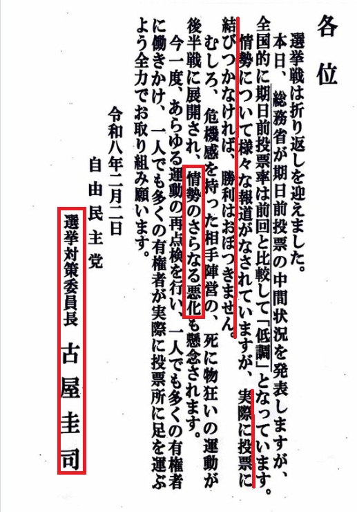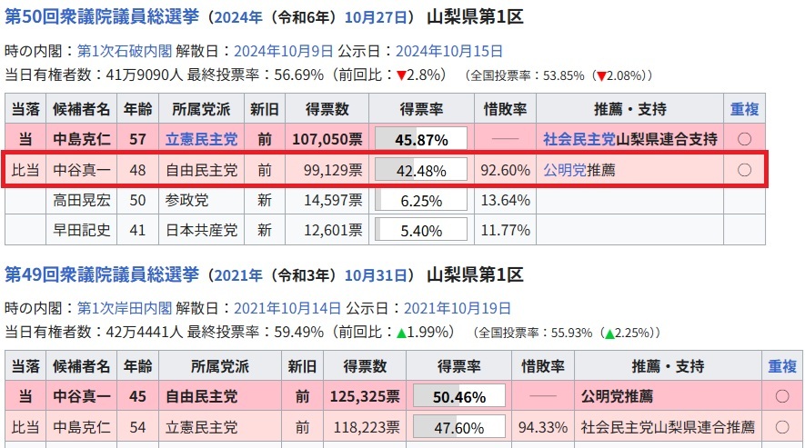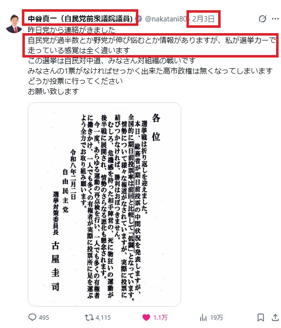 自民党前職、山梨一区の中谷真一候補がXに「朝日、読売の情勢調査と選挙カーで回る肌感覚は違う」と言う趣旨の投稿をしており同時に古屋圭司選対委員長からの通達を添付していた。中谷氏は自衛隊出身で落選した髭の佐藤正久の元秘書。