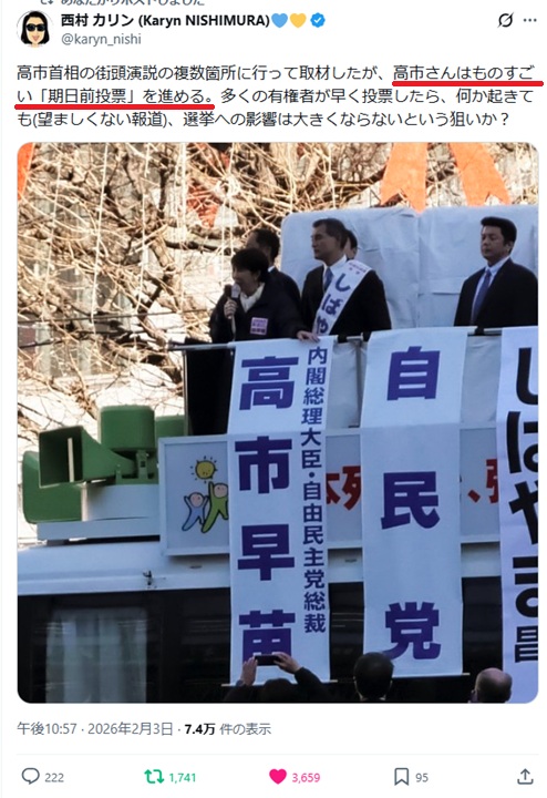 西村カリンさんが受けた印象と同じ。You tubeで見る高市の演説は田舎の中学の生徒会長選のレベルで聞くに堪えないが「期日前投票を異様に進める」のには違和感を感じた。