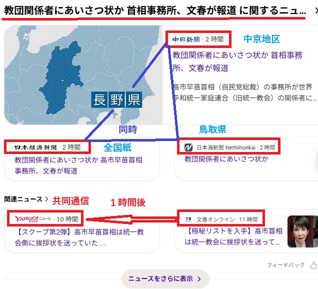 共同通信は文春オンラインのアップの1時間後にネット配信しました。共同が報じたので8時間後に日経(全国紙)中日新聞(名古屋中京地区)日本海新聞(鳥取)が同時にネット配信しています。